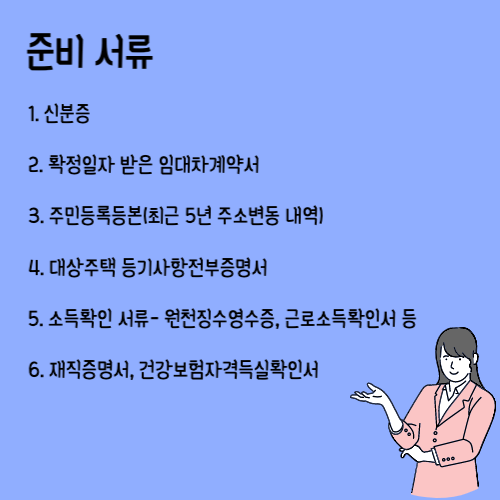 대상자에 따라서 서류 상이하지만 은행에 여러 번 방문하는 것보단 미리 철저하게 준비해야 가는 것이 좋을 것 같습니다. 우선 기본적으로 필요한 서류는 확정일자를 받은 임대차계약서와 임차보증금의 5% 이상을 납입한 영수증이 필요합니다. 아울러 주민등록등본이 필요합니다. 최근 5년 주소변동 이력이 포함된 1개월 이내에 발급분이 필요합니다. 또한 대상주택 증기사항전부증명서, 소득확인서류(원천징수영수증, 소득금액증명원, 신고사실 없음 증명원 등), 재직 관련서류(건강보럼자격 득실 확인서) 그리고 신분증이 필요합니다. 제출해야 하는 필수 서류는 은행과 다시 한번 확인하는 것이 좋겠습니다.