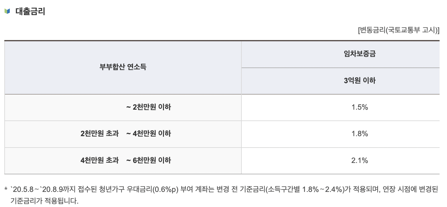 부부합산 연소든 2천만 원 이하는 연 1.5%, 부부합산 연소득 4천만 원 이하는 연 1.8% 금리이며 부부합산 연소득 5천만 원 이하는 연 2.1% 대출금리를 받을 수 있습니다. 요즘 같이 고금리 시대에 굉장히 저렴한 금리라고 볼 수 있습니다. 마지막으로 이용기간은 최초 2년이며 4회 연장이 가능하기 때문에 최대 10년까지 이용이 가능합니다.